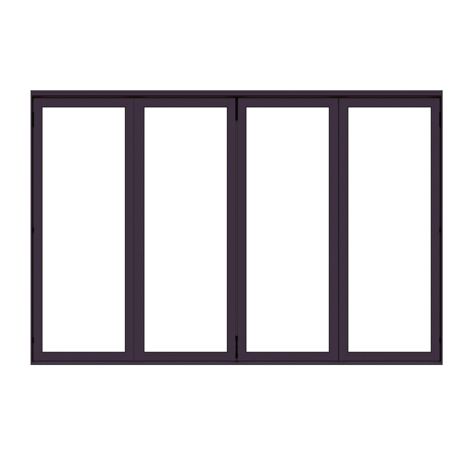 Exterior bifold patio doors made from a series of multiple panels fold up against the wall with out-swing/in-swing option